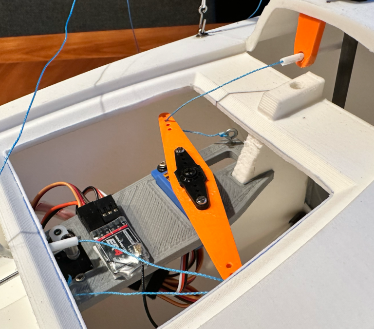 Standard-Komponenten wie Servos und Segelwinden werden eingebaut und über Schoten und Schubstangen angeschlossen.